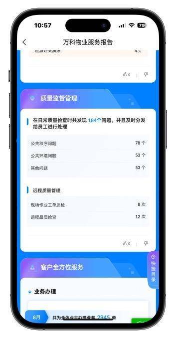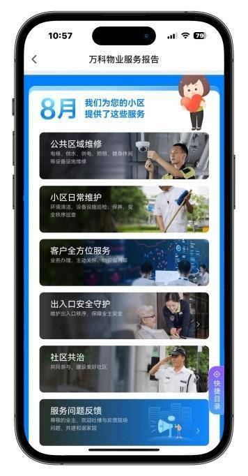 “我们在行业内首创了数字服务报告,承诺的每一项内容,都在这份报告中一一进行呈现。”邹明回复,这个报告会以月为单位自动生成,每一个业主都可以通过“住这儿”APP随时随地查看,报告中包括公共资源收益、小区重大事项进展、公共区域维修、安全秩序巡检、小区文化活动等。